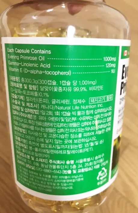 네츄럴라이즈 감마리놀렌산 함량은 240mg으로 높은 편입니다. 주원료인 달맞이꽃 종자유는 1000mg(99.9%) 함유되어 있습니다. 감마리놀렌산은 달맞이꽃 종자유와 모유와 같은 물질에 많은 양이 포함되어 있고, 프로스타글란딘이라는 성분의 모체가 되는 물질입니다.