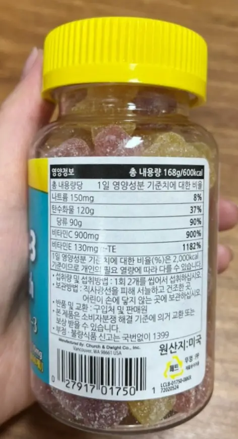 한 통에는 EPA 100mg와 DHA 330mg이 함유되어 있고, 비타민C 900mg, 비타민E 130mg a-TE 포함되어 있습니다. 아이들에게 권장하고 있는 일일 권장량은 2정입니다. 맛있고 쉽게 먹을 수 있기에 아이들이 필요로 할 때 씹어서 먹을 수 있도록 시간 제약 없이 하루 2개를 섭취할 수 있도록 하면 됩니다.