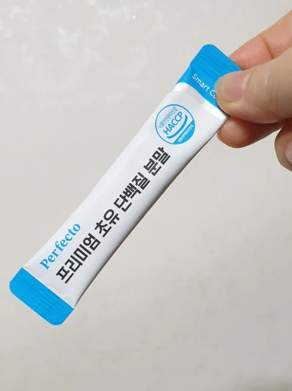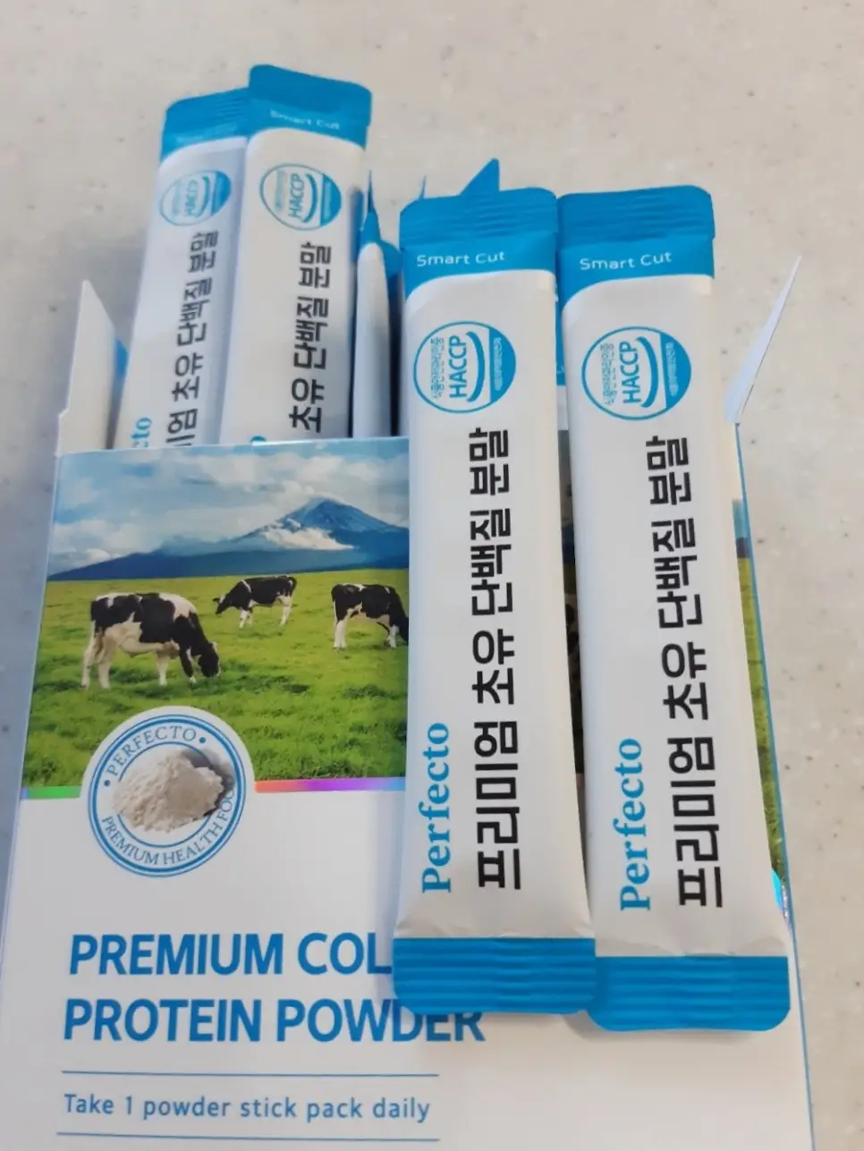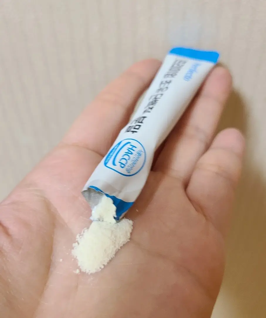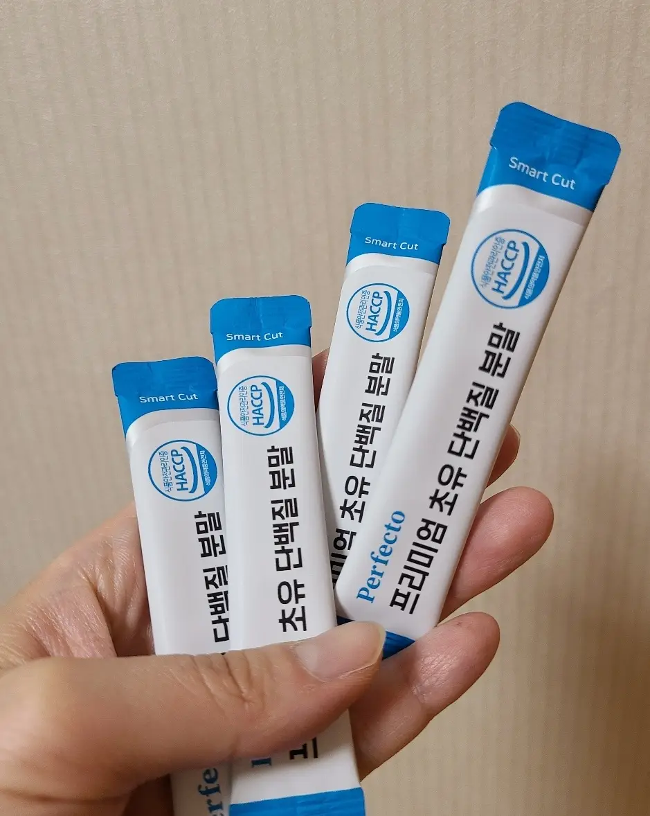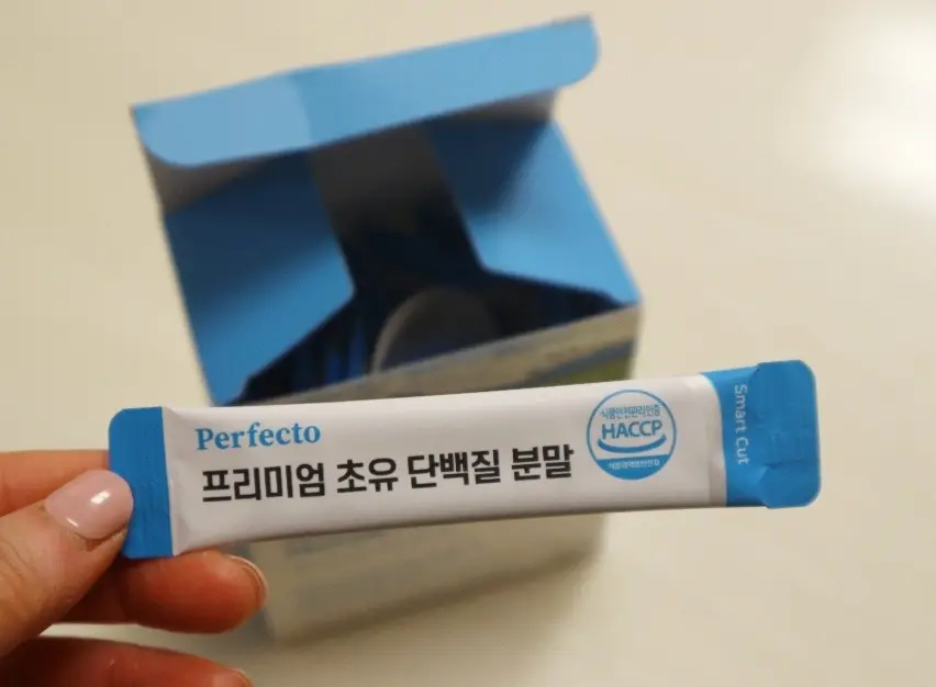 "퍼펙토 초유단백질은 분말 입자가 매우 미세한 편이어서 바람이 조금만 불면 날아갈 수 있어서 조심해야 해요. 물 한 모금을 먼저 마신 다음에 이지컷을 잘라서 입에 그대로 넣으면 쉽게 넘길 수 있습니다. 원료 성분도 우수하고, 적당한 단맛이 있어서 좋아요."